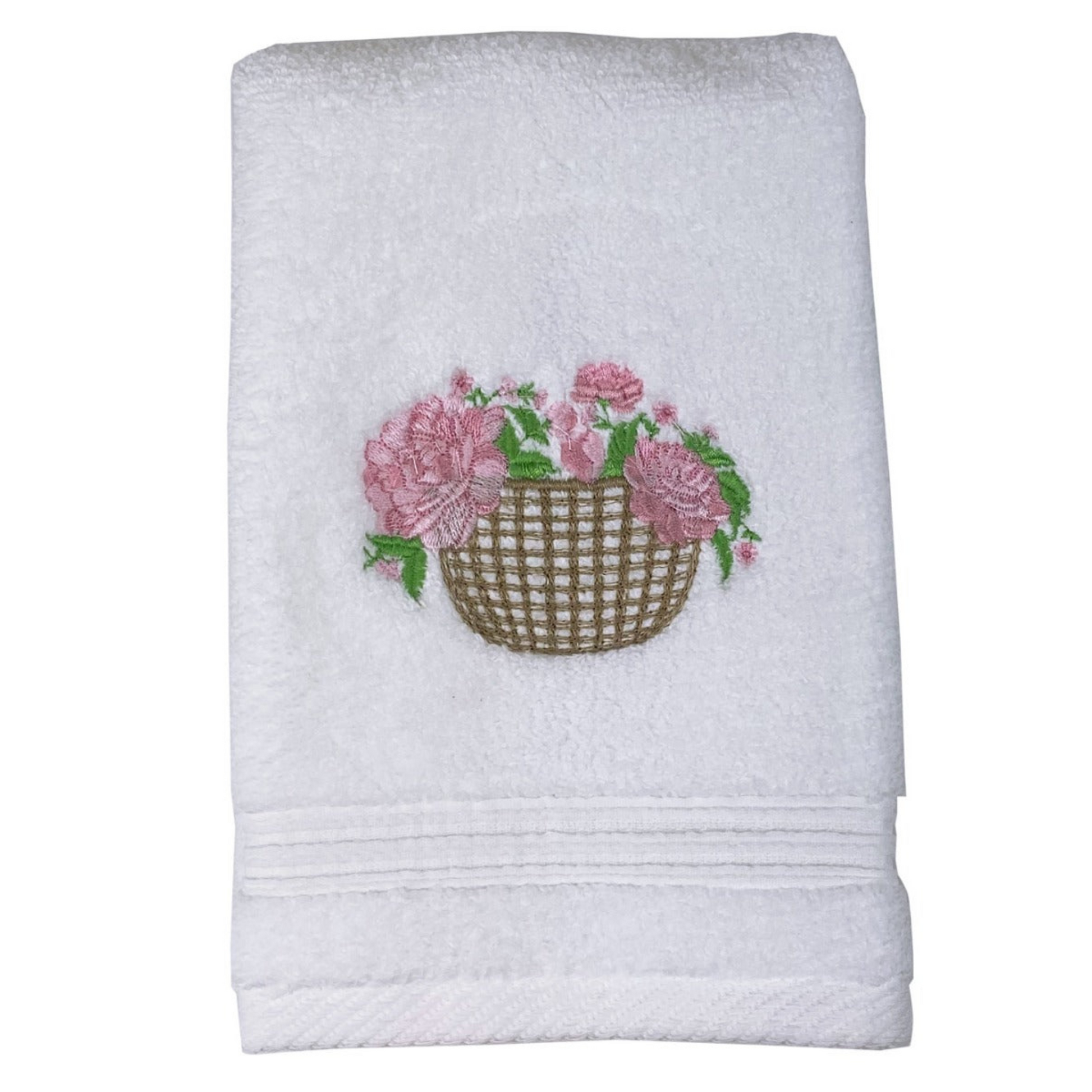 This charming towel makes a lovely addition to your bathroom. Made of a soft white terry with a sweet Basket of Peonies embroidered motif.
