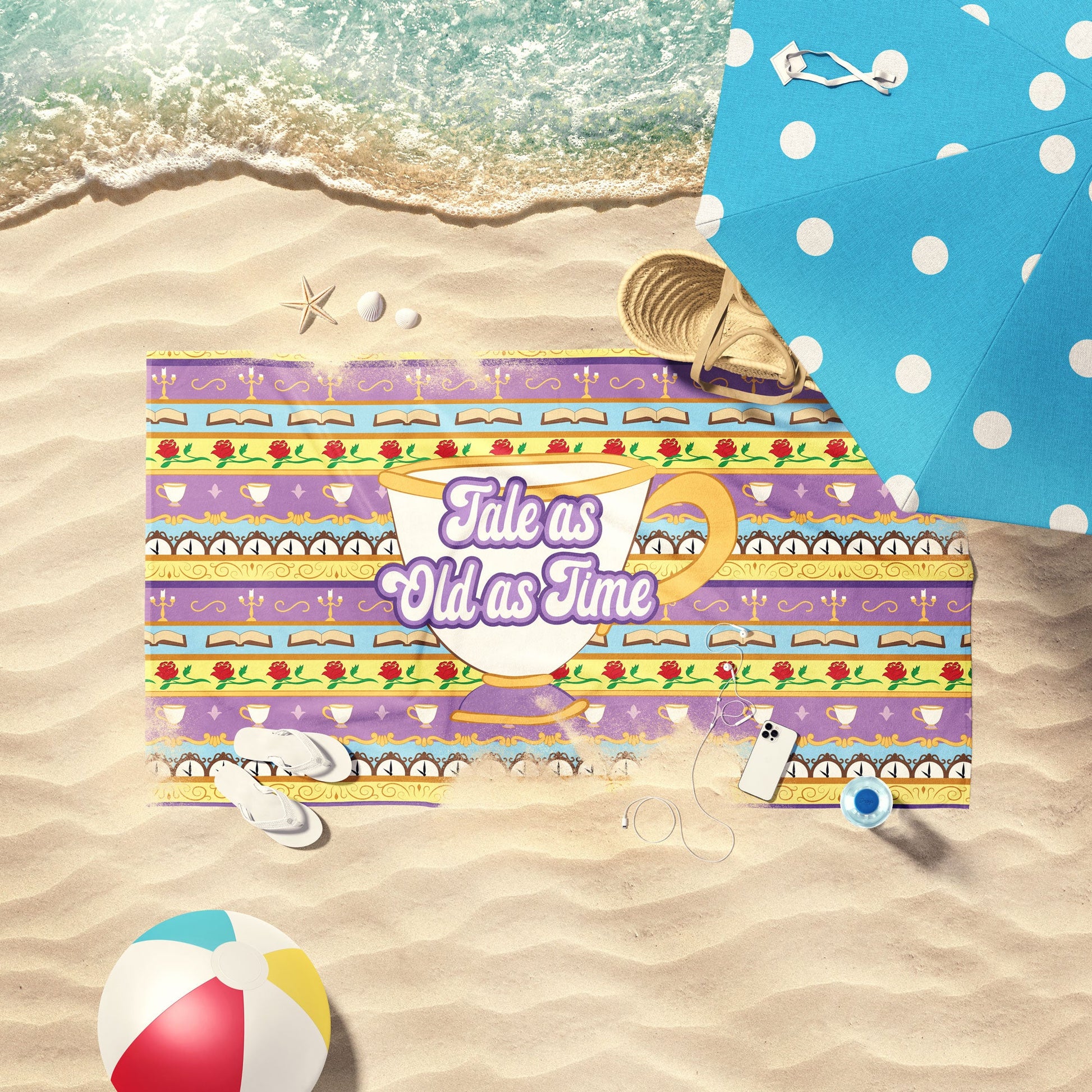Tale as Old as Time Teacup Red Rose Princess Stripe Beach Towel